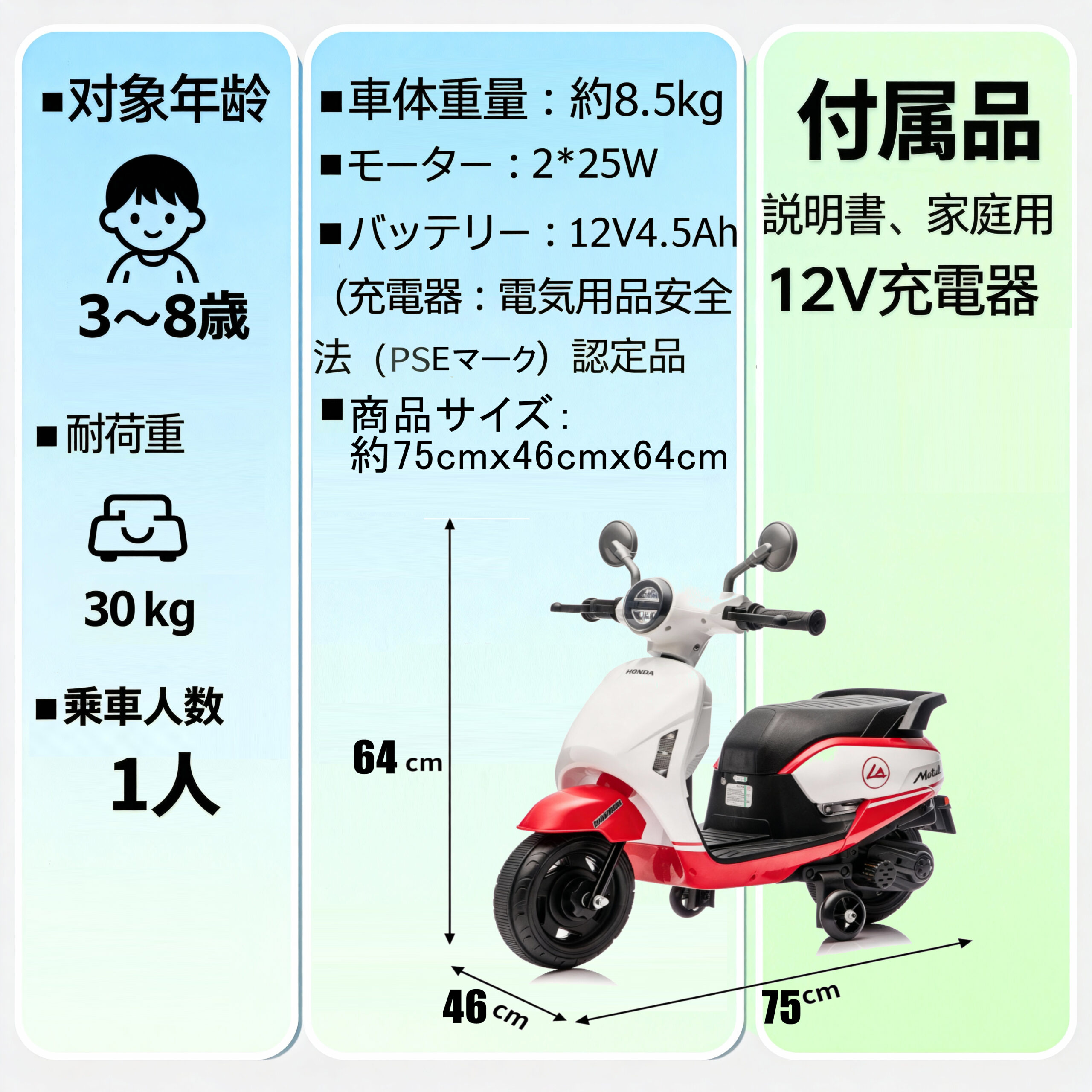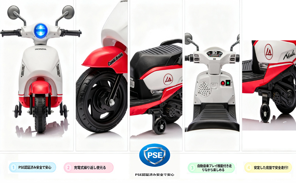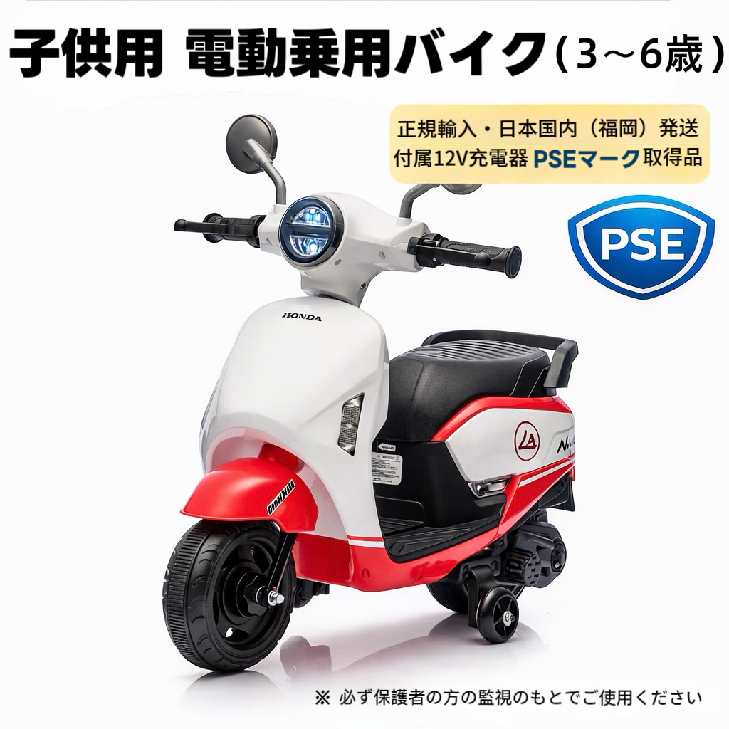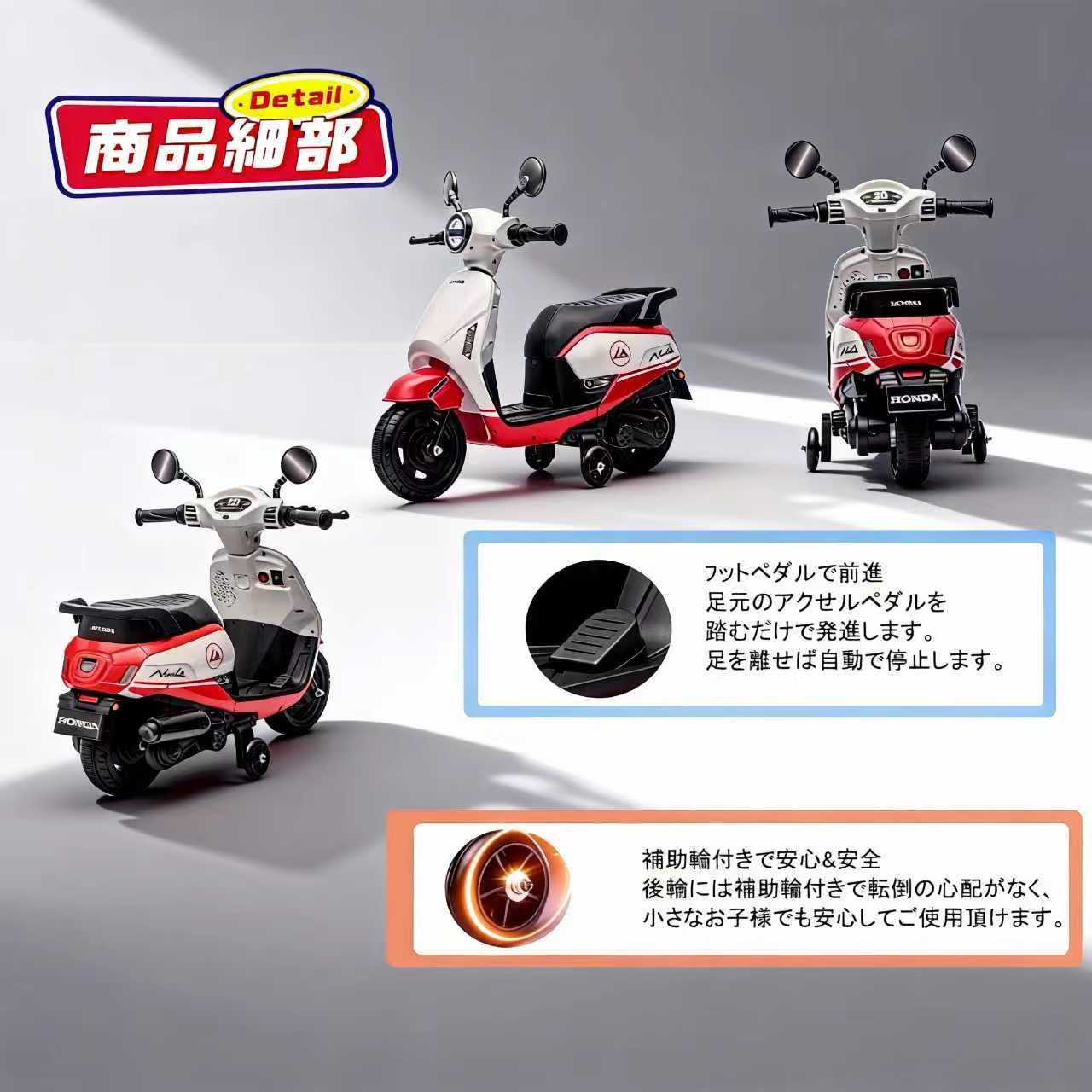 商品仕様・特長(日本語) ・本田公式ライセンス取得モデル 本田の正規ライセンスに基づいて製造されたキッズ用電動バイクです。 ・対象年齢:3〜6歳 安全性を考慮し、最高速度は時速3〜5kmに設定されてい…